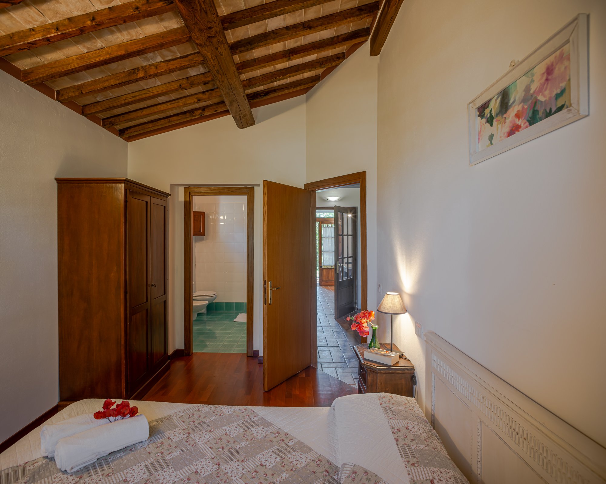 The seven double rooms have a private bathroom and overlook the beautiful Tuscan countryside. In some rooms, it is possible to add an extra single bed upon request, for an additional fee. However, baby beds and highchairs can be added upon request at the time of booking (the first two will be complimentary).